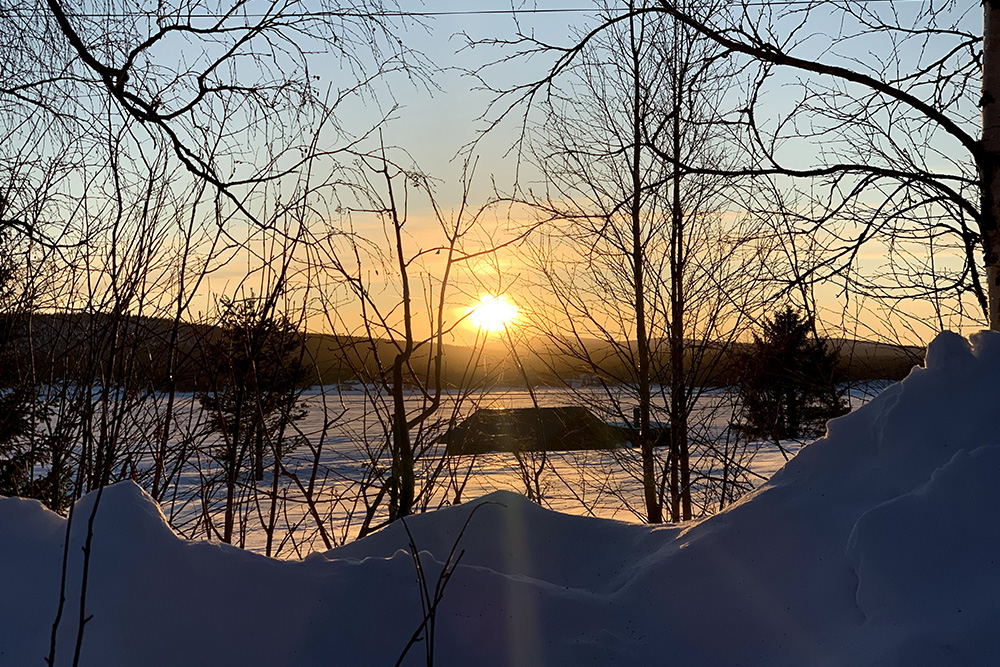 Caminhada com raquetes de neve por florestas silenciosas até um lago congelado. Vivência de pesca no gelo, uma das práticas mais tradicionais da região.